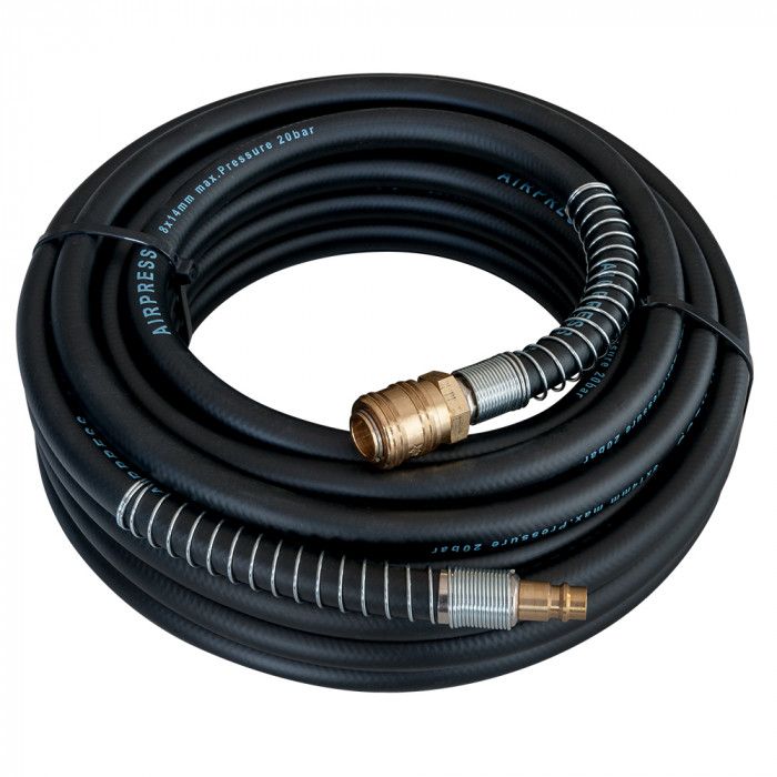 Gumene cijevi ojačane pletenicom od vlakana karakteriziraju se izvanrednom fleksibilnošću i izdržljivošću – do 20 bara. Čak i na niskim temperaturama zadržavaju svoju fleksibilnost olakšavajući korisniku kretanje s alatom i omogućujući korištenje 100% duljine cijevi. Gumene cijevi standardno su opremljene utikačem i brzim spojem tipa EURO. Izravno do obujmica postavljene su opruge koje sprječavaju savijanje cijevi. Unutarnji promjer od 8mm omogućuje prijenos više od 400l komprimiranog zraka u minuti. Posebno se preporučuju za napajanje pneumatskih alata, puhala ili pištolja za prskanje. Gumene cijevi ne uzrokuju ogrebotine, stoga je njihova upotreba sigurna u auto radionicama.